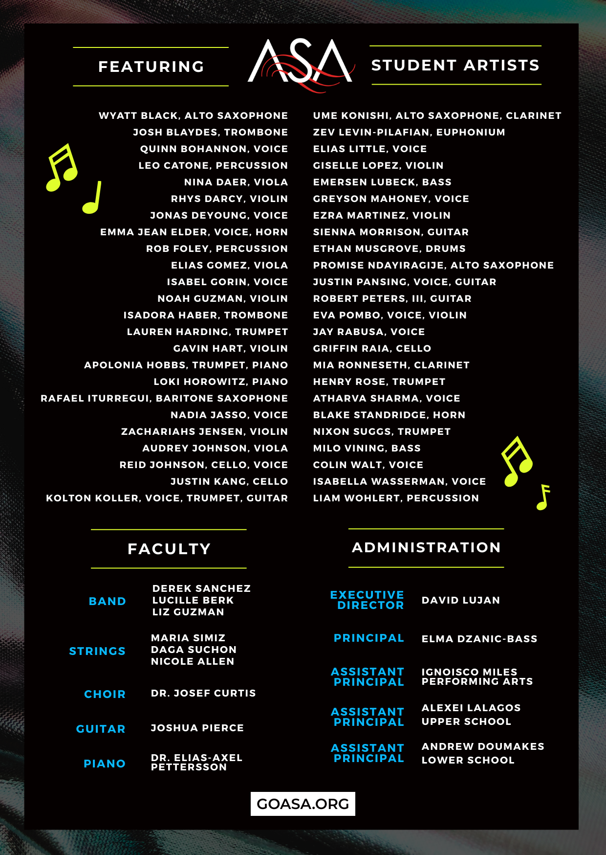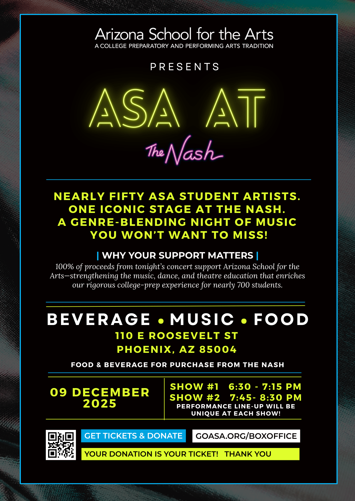 Supporting our Signature Series performances is seamlessly integrated into each ticket purchase. Tickets are offered on a sliding scale from $5 to $25 —or more if you wish to provide additional support – making it accessible for anyone to support! The general public is also welcome to attend and support our vibrant performing arts program. Each ticket purchased directly benefits our performing arts program, ensuring students have the resources and opportunities to bring their creativity to life. THANK YOU!