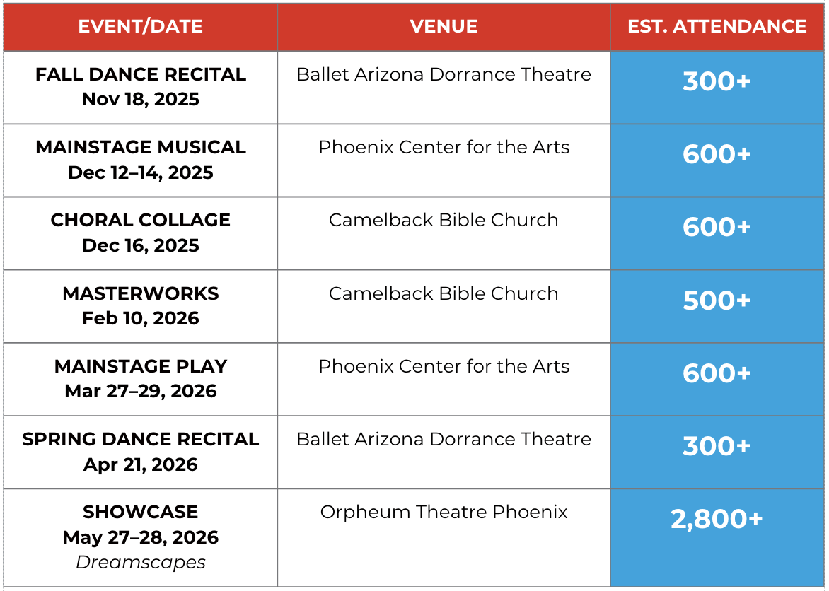 Your impact: You power high-visibility events that attract community leaders, families, and arts patrons—showcasing your brand as a champion of youth arts education.